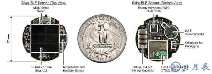 [圖1 | 微型無線傳感器使用具有集成BLE射頻的微控制器(MCU)而創(chuàng)建,經(jīng)優(yōu)化后僅用能量采集電源管理IC所提供的電源運(yùn)行。圖中為完整的無線傳感器 -- CYALKIT-E02太陽能供電BLE傳感器參考設(shè)計套件(RDK)。]