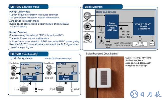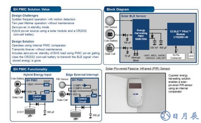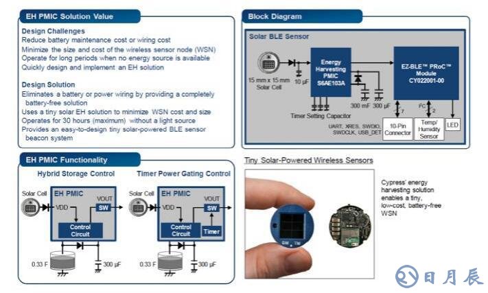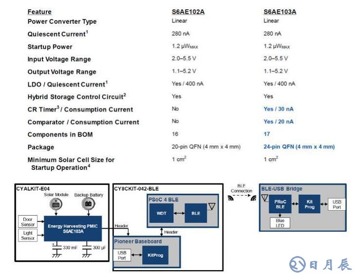 降低功耗技術(shù)的說明可參考賽普拉斯(Cypress)CYALKIT-E02太陽能供電BLE傳感器參考設(shè)計套件(RDK)。該RDK包含一個Cypress PSoC 4 BLE與S6AE10xA能量采集電源管理IC(PMIC)。