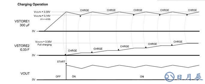 圖12中的波形顯示將能量存儲到VSTORE2時的充電曲線。S6AE10xA將能量存儲到VSTORE1(小電容器)和VSTORE2(大電容器)中。存儲在VSTORE1中的能量用于系統(tǒng)運(yùn)行,其余能量用于VSTORE2(VST2)的子儲能器件充電。VSTORE2中持續(xù)為系統(tǒng)提供能量,因此,即使在沒有環(huán)境光線的情況下,系統(tǒng)也能繼續(xù)運(yùn)行一段時間。