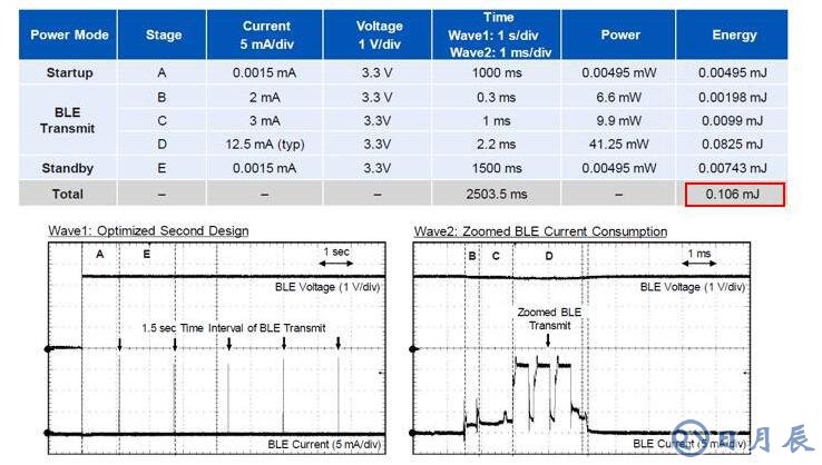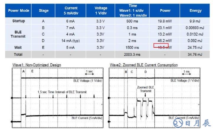 可以使用電壓和電流波形計算平均消耗電流以確定BLE設(shè)計的高效。圖4顯示了無功率優(yōu)化設(shè)計的功耗結(jié)果。