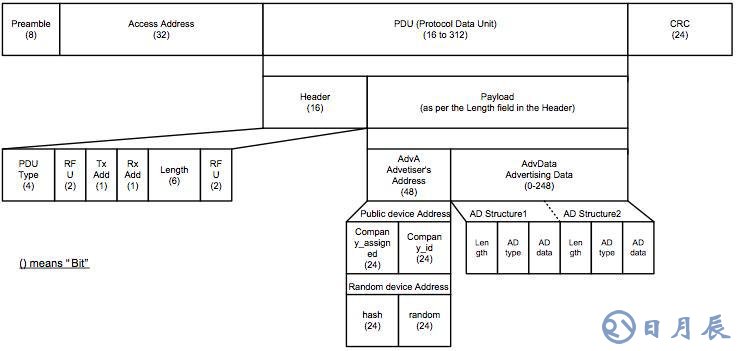 圖2顯示了廣播通道數(shù)據(jù)包格式的BLE鏈路層格式。BLE鏈路層擁有“Preamble”(前導(dǎo)碼)、“Access Address”(接入地址)、“Protocol Data Unit(PDU)”(協(xié)議數(shù)據(jù)單元)和“Cyclic Redundancy Code(CRC)”(循環(huán)冗余碼)。請注意,以下信息僅適用于廣播通道數(shù)據(jù)包格式,不含“數(shù)據(jù)通道數(shù)據(jù)包”。