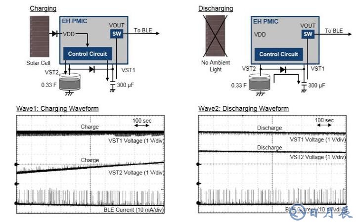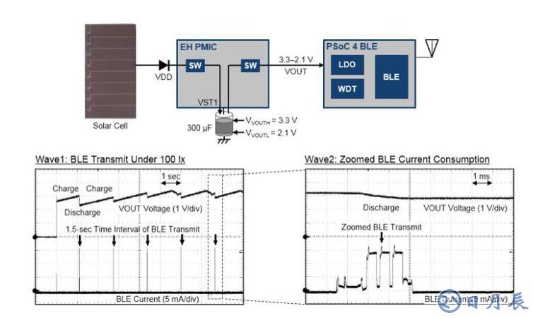 Wave1顯示了基于太陽能的BLE運(yùn)行,Wave2顯示了發(fā)送時的BLE電流消耗。PMIC首先將太陽能存儲到VSTORE1(VST1)上的一個300-μF陶瓷電容器上,當(dāng)VST1達(dá)到VVOUTH時,能量被發(fā)送到MCU用于BLE運(yùn)行。