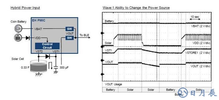 圖13中的框圖顯示了混合電源輸入控制模式。Wave1顯示的是PMIC如何控制兩個電源(太陽能和電池)。PMIC通過轉(zhuǎn)換這兩個電源在不同場景下驅(qū)動系統(tǒng)。環(huán)境光線通常是持續(xù)的,但某些地方可能沒有持續(xù)的光線。PMIC能夠自動轉(zhuǎn)換這兩個電源,在沒有光線的情況下繼續(xù)供電。