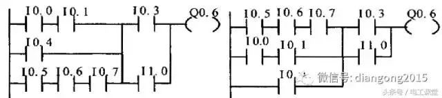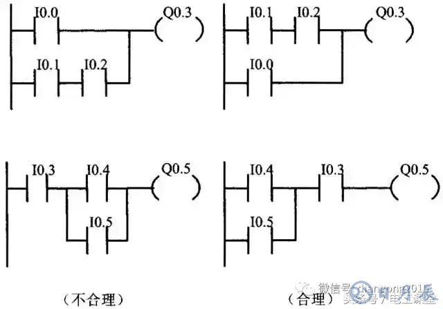 (3)幾個串聯(lián)支路相并聯(lián),應將觸點多的支路安排在上面;幾個并聯(lián)回路的串聯(lián),應將并聯(lián)支路數(shù)多的安排在左面。按此規(guī)則編制的梯形圖可減少用戶程序步數(shù),縮短程序掃描時間。