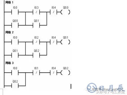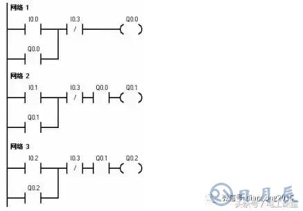 2. 單向順序停止控制電路就是要求按一定順序停止已經(jīng)執(zhí)行的各機構(gòu)。只有Q0.2被停止后才可以停止Q0.1,若想停止Q0.0,則必須先停止Q0.1。I0.4為急停按鈕。