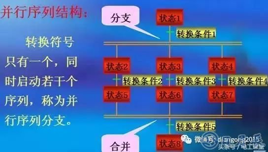 功能表圖的基本結(jié)構(gòu):單序列結(jié)構(gòu)、選擇序列結(jié)構(gòu)、合并序列結(jié)構(gòu)