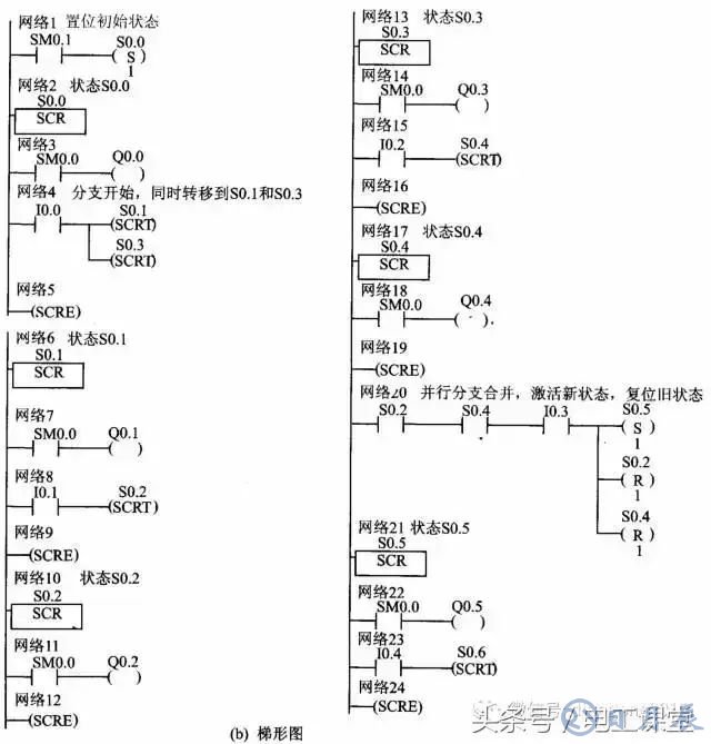 (6)在狀態(tài)發(fā)生轉(zhuǎn)移后,所有的SCR段的元器件一般也要復位。如果希望繼續(xù)輸出,可使用置位/復位指令。
