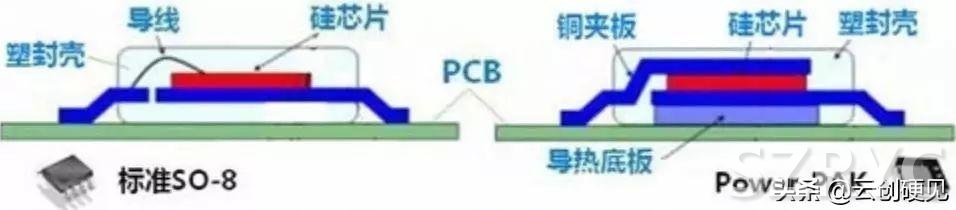 TO、D-PAK、SOT、SOP等采用焊線式的內(nèi)部互連封裝技術(shù),當(dāng)CPU或GPU供電發(fā)展到低電壓、大電流時(shí)代,焊線式的SO-8封裝就受到了封裝電阻、封裝電感、PN結(jié)到PCB和外殼熱阻等因素的限制。